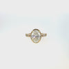This bold oval-cut laboratory grown diamond ring is set in polished 14K yellow gold and framed in a refined under bezel setting. Subtle petite claw prongs beneath the bezel secure the 4.01 carat center stone while enhancing its brilliance with added dimension. Tapered baguette accents along the band provide structured balance, creating a design that feels architectural, powerful, and timeless.